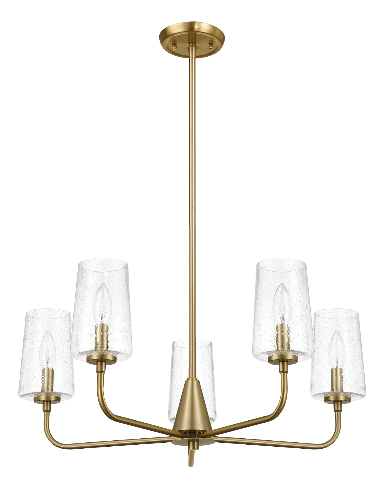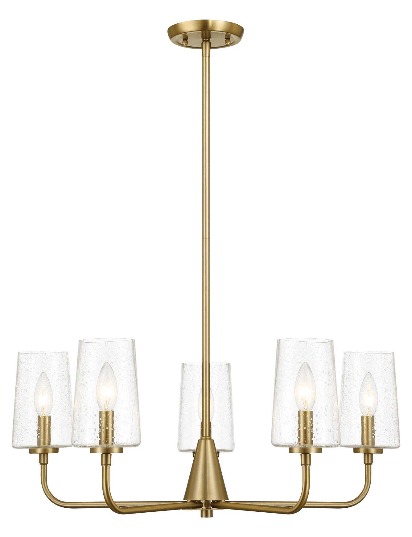 With its clear seeded glass and satin brass finish, this chandelier exudes an air of elegance and sophistication. The five lights offer plenty of illumination for any event or occasion, making it both a practical and stylish choice for your home.